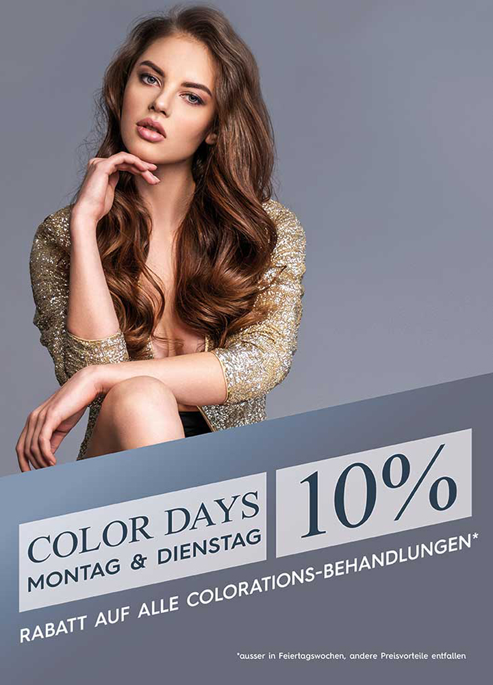 Am Montag und Dienstag gewähren wir Ihnen 10% Rabatt auf alle Colorations-Behandlungen.